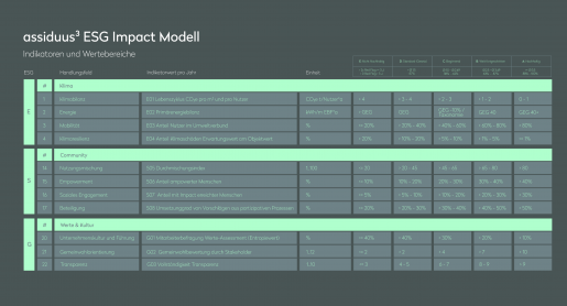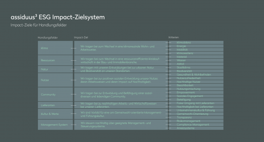 Unser Verständnis verantwortungsvoller Projektentwicklung haben wir in das assiduus³ ESG Impact-Modell für Immobilien übersetzt. Es bildet ESG ganzheitlich in 25 klar definierten Kriterien ab und ist strategische Grundlage für die Entwicklung unserer Immobilienprojekte.