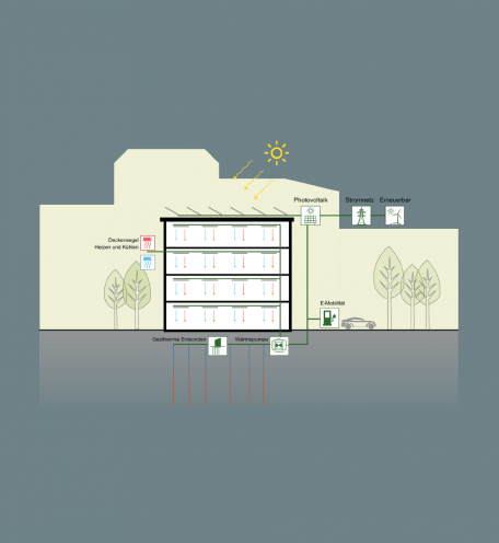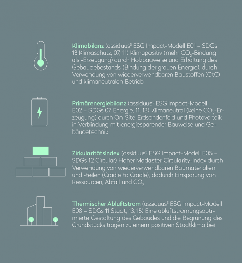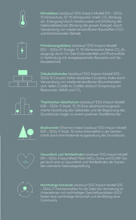Beste Lebenszyklus-Klimabilanz (CO₂) für Bürogebäude durch klimapositive Bauweise – 100 % Holzbauweise und Bestandserhaltung – sowie klimaneutralen und Energie autarken Betrieb – Kühlen und Heizen mittels eigenem Erdsondenfeld und Photovoltaik – und weitestgehenden Kreislaufwirtschaftsansatz – u. a. Wiederverwendung von Baumaterialien