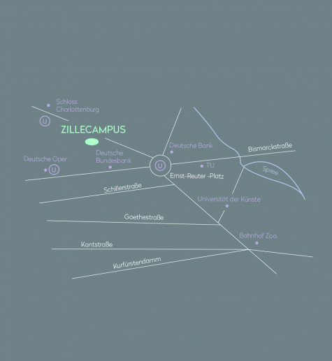 Nahe dem Ernst-Reuter-Platz, zwischen der Bismarckstraße – Berlins großer West-Ost Tangente vom Theodor-Heuss-Platz, Großer Stern (Siegessäule), Unter den Linden zum Alexanderplatz – und der Otto-Suhr-Allee liegt im ruhigen Charlottenburger Kiez der Zillecampus.