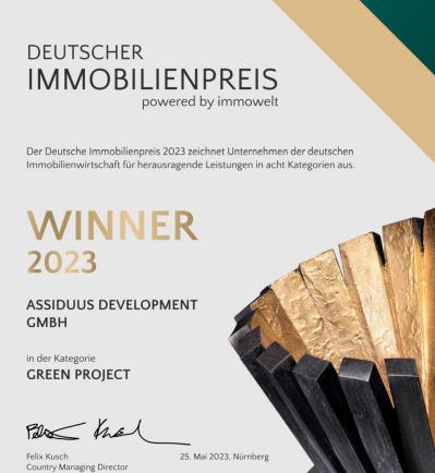 Der Deutsche Immobilienpreis wurde 2020 von der immowelt GmbH ins Leben gerufen und findet im Zweijahresrhythmus statt. Mit dem Award honoriert eine unabhängige Jury Unternehmen für ihren Einsatz, ihre Kreativität und Nachhaltigkeit. In diesem Jahr konnte die Preisverleihung nach einer Corona-Pause in den Jahren 2021 und 2022 wieder live vor Publikum zelebriert werden.